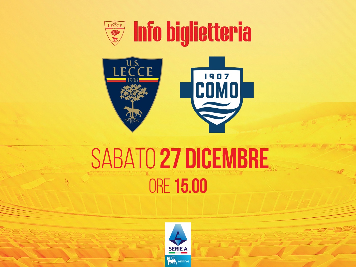 L’U.S. Lecce comunica che a partire dalle ore 10:00 di lunedì 22 dicembre 2025 sarà attiva la vendita dei biglietti validi per la gara del Campionato di Serie A ENILIVE 2025/2026 Lecce-Como, in calendario sabato 27 dicembre 2025 alle ore 15:00.