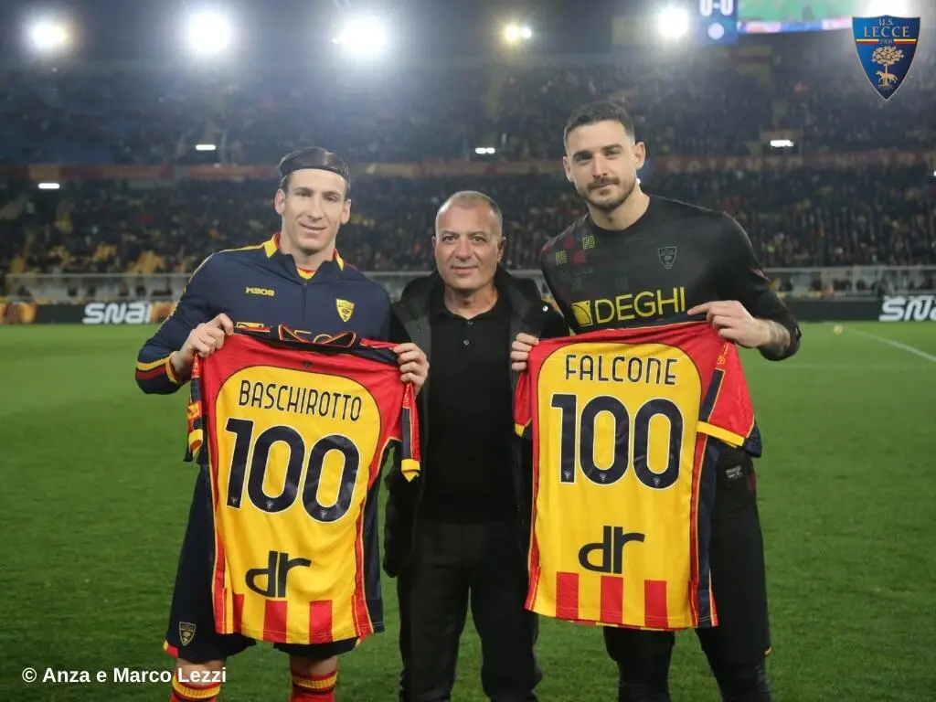 Prima del fischio d’inizio della gara Lecce - Inter, il Presidente Saverio Sticchi Damiani ha consegnato ai calciatori Wladimiro Falcone e Federico Baschirotto una maglia celebrativa per le 100 presenze in giallorosso.