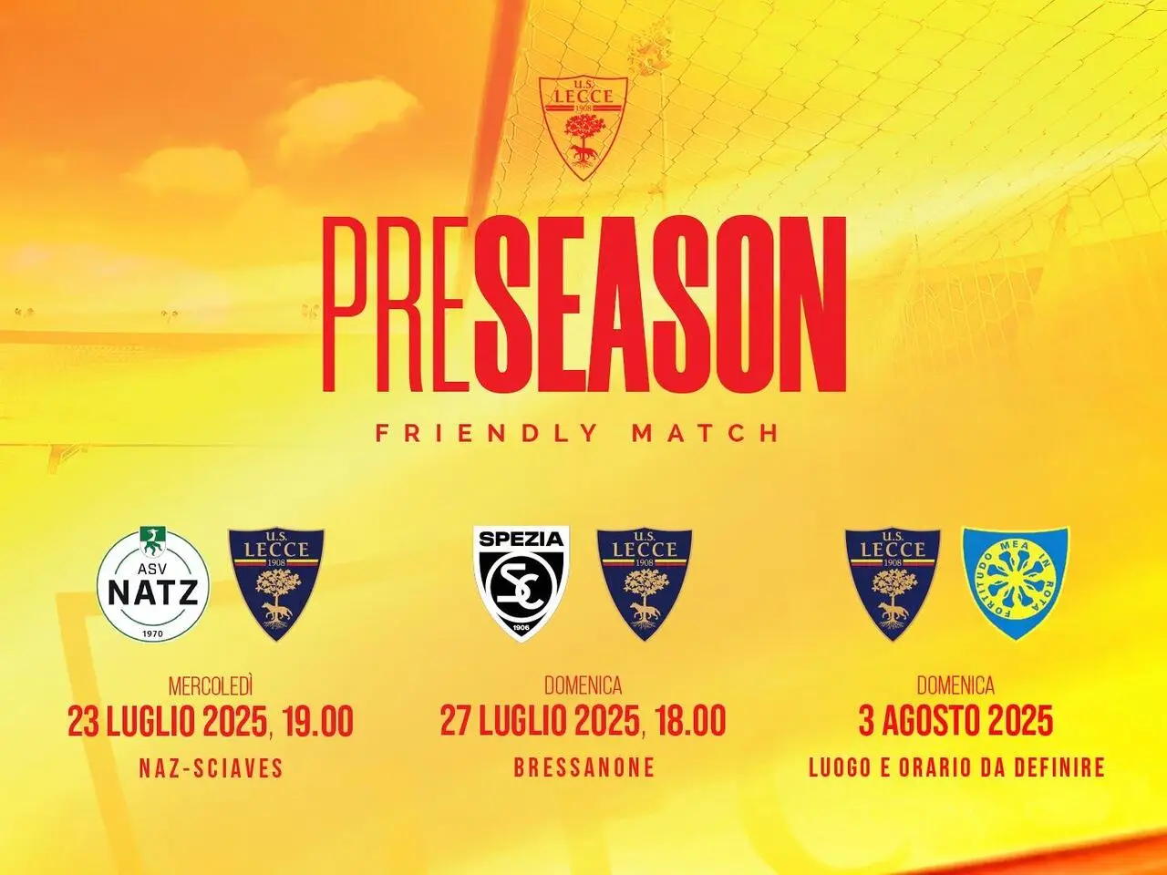 L'U.S. Lecce comunica che durante la fase di ritiro precampionato, che si svolgerà a Bressanone (Bolzano) dal 21 luglio al 4 agosto, i giallorossi disputeranno quattro test amichevoli.