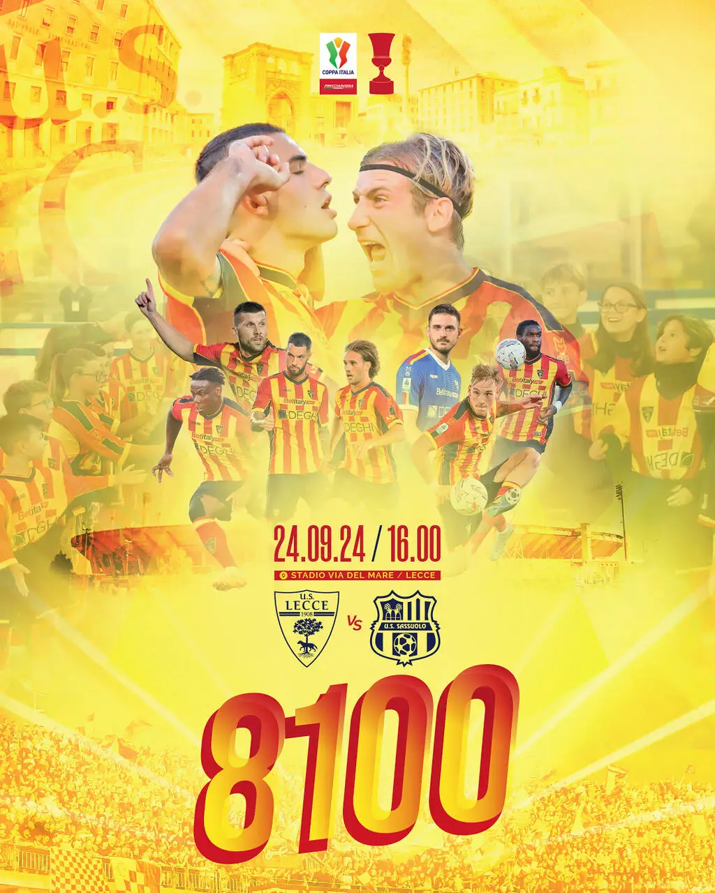 In occasione della gara di Coppa Italia Frecciarossa Lecce - Sassuolo in programma il 24 settembre alle ore 16:00, oltre 8.100 bambini, bambine, ragazzi e ragazze degli istituti scolastici del Territorio e giovani calciatori e calciatrici delle scuole calcio del Salento hanno aderito all’iniziativa dell’U.S. Lecce in collaborazione con la direzione generale dell’Ufficio Scolastico Regionale e Provinciale e con la Commissione Permanente del Senato “Cultura, istruzione pubblica, ricerca scientifica, spettacolo e sport”.